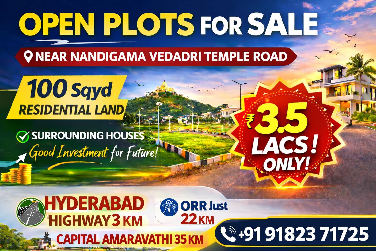 If you are searching for Open Plots in Vijayawada at a budget-friendly price with great future growth potential, this is an excellent opportunity. Premium residential plots are now available near Nandigama on Vedadri Temple Road at a very attractive price of ₹3,49,999 for 100 Sq.Yds.
